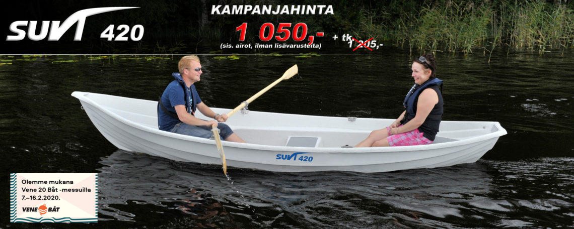 Suvi 420 on kevyempi savolaismallinen soutuvene mökki- ja kalastuskäyttöön. Turvallinen, uppoamaton, hiekkahartsikölillä varustettu malli. Erittäin kevyt soutaa. Lyhytrikiselle moottorille. Keveytensä ansiosta sähköperämoottori on hyvä vaihtoehto moottoriksi.