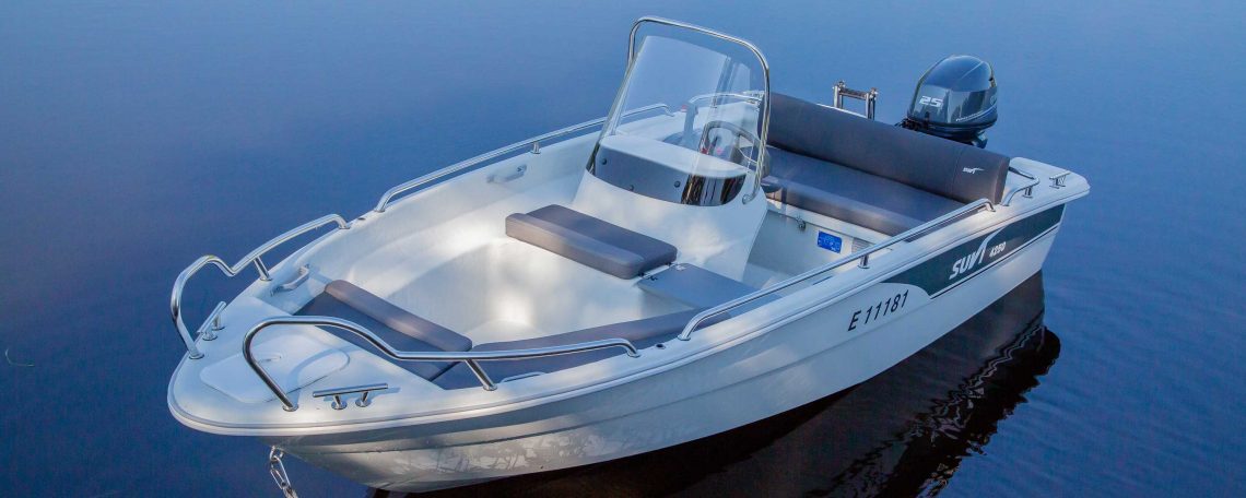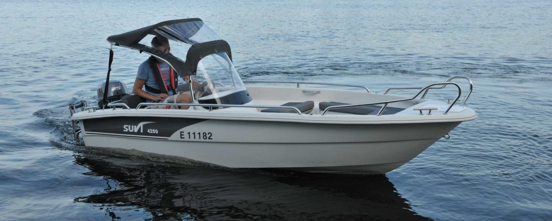 Suvi 4250 on sadevesityhjenevä malli 4 henkilölle. Moottoriveneessä on reilut säilytystilat (mm. köysiboksit keulassa ja perässä sekä vapalaatikko n. 120 cm). Moottorisuositus max. 25 hv. Vene mökki- ja kalastuskäyttöön.Soutumahdollisuus. Pitkärikiselle moottorille.