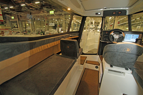 Tilavassa hytissä kippari istuu lähes veneen keskilinjalla. Ohjaamon tiloja sekä hallintalaitteiden sijoittelua on mietitty käyttäjän kannalta tarkkaan. 12-tuumaiselle plotterinäytölle on luonteva paikka kojetaulussa, aivan kuljettajan käden ulottuvissa ilman kurkottelua. Ajamisen aktiiviset hallintalaitteet on keskitetty kuljettajan oikealle puolelle, samoin kaukohallintalaite ja trimmitasojen kytkimet ja hakuvalojen katkaisimet. Ohjaajalle vieressä on myös hyvin säilytystilaa pikkutavaralle.